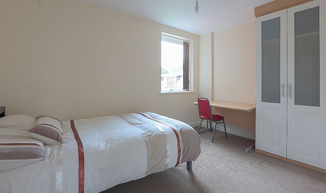 The apartment is fully furnished with Leather Sofas, Table & Flat Screen TV in the open plan living area, plus each bedroom is fitted with a Double Bed, built in Wardrobe, Desk & Chair.