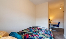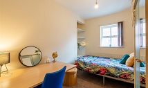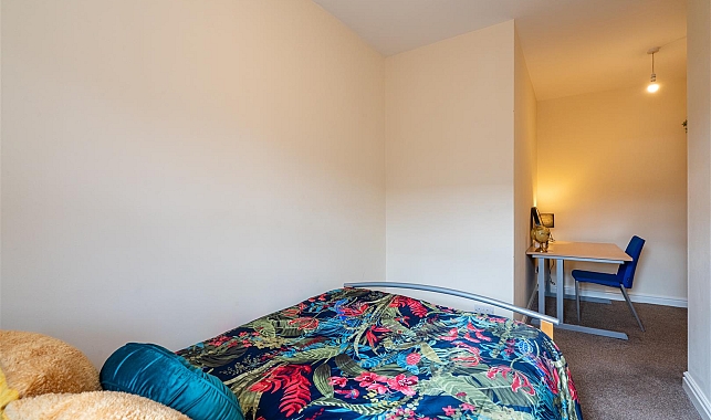 The home features six generous double bedrooms, each furnished with a bed, desk, chair, and storage. The two modern bathrooms are fitted with contemporary fixtures and plenty of space for shared living.