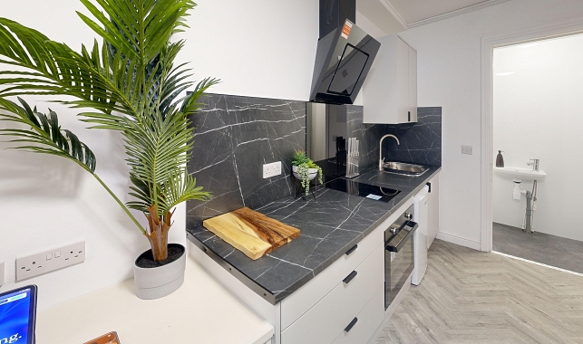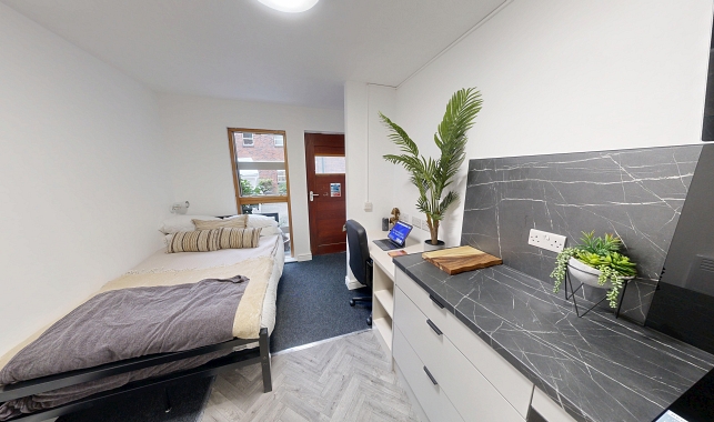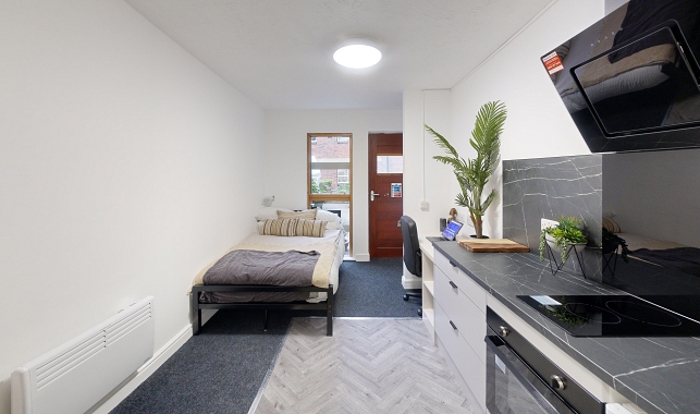 Self-contained student living starts here. Enjoy a small double bed, modern en suite shower room and study area. Cook up a storm in your modern mini-kitchen!